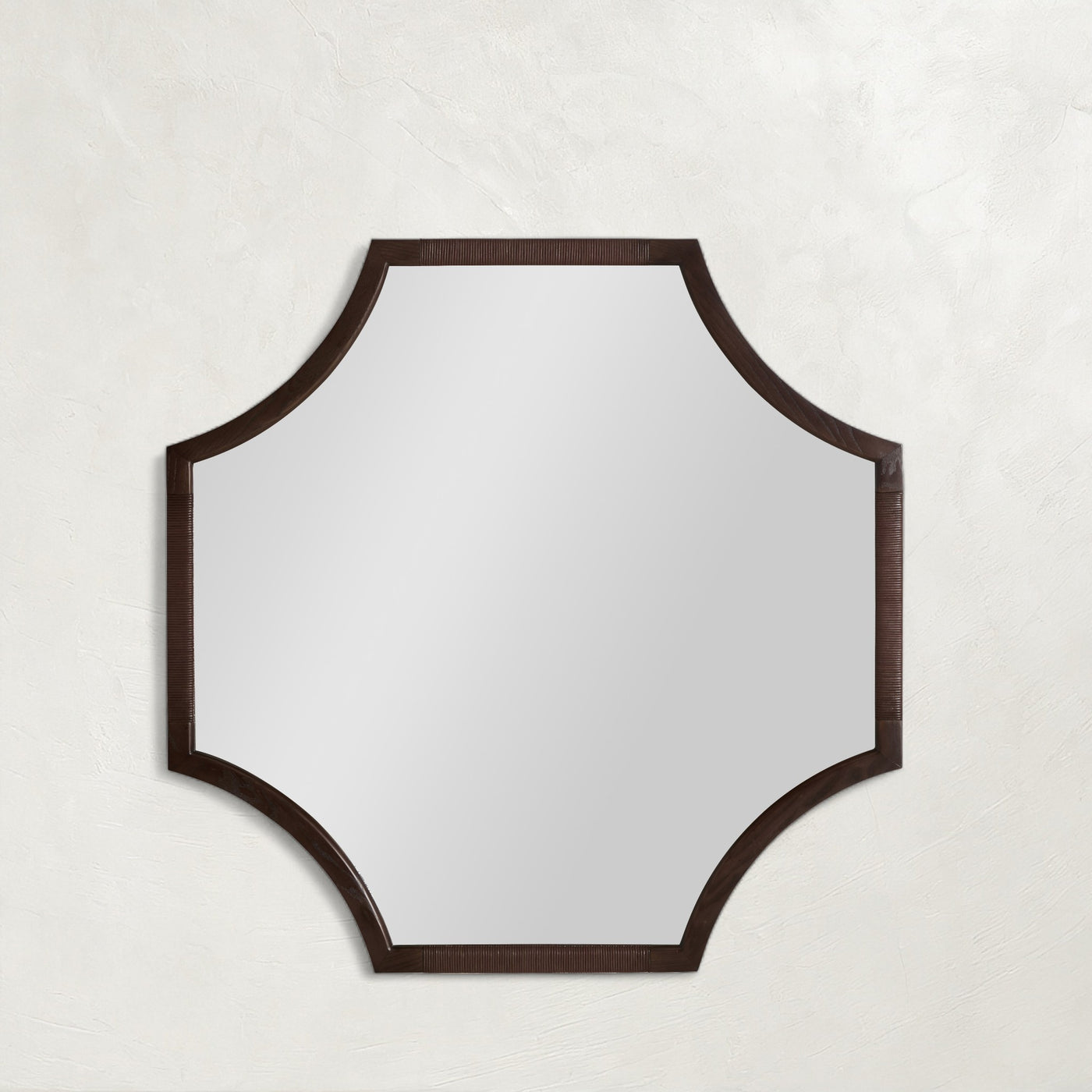 The Darian Accent Mirror in the Dusk finish exudes warmth and sophistication, crafted from oak wood in a rich Dusk tone and paired with Gramado Saddle leather for a striking textural contrast. The mirror’s quatrefoil-inspired shape, with four gently concave sides, adds a sculptural elegance that draws the eye while maintaining a sense of balance. The thin, refined frame highlights the natural grain of the oak, while the supple leather wrapping introduces warmth and texture. Measuring 42" x 42", this mirror brings understated luxury and timeless charm to entryways, living spaces, or bedrooms, blending effortlessly with transitional and contemporary interiors.