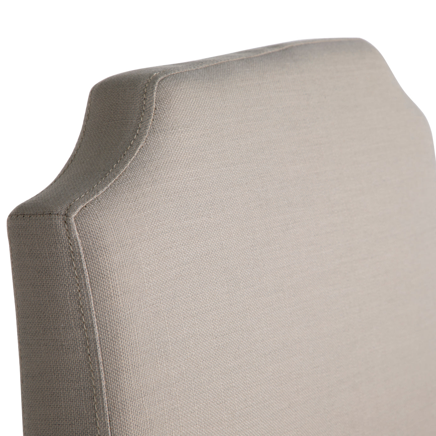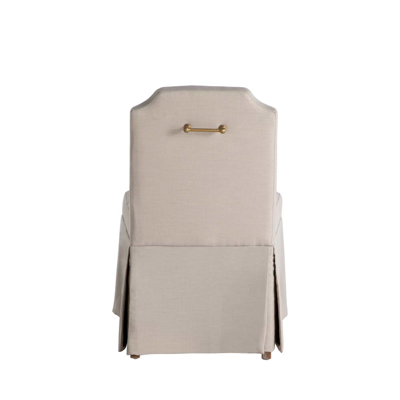 The classic silhouette of our Edmund Dining Chair is a versatile piece, perfect for your dining table, desk, or vanity. Its elegant, armless profile features notched sides, while the fully skirted base creates a clean and sophisticated look. Upholstered in a durable, easy-care performance fabric, this chair is designed for both style and convenience. The plush cushioning provides comfort, supported by a sturdy wood frame for lasting quality. A functional handle on the back adds a practical touch, making the Edmund Dining Chair a timeless addition to any room.