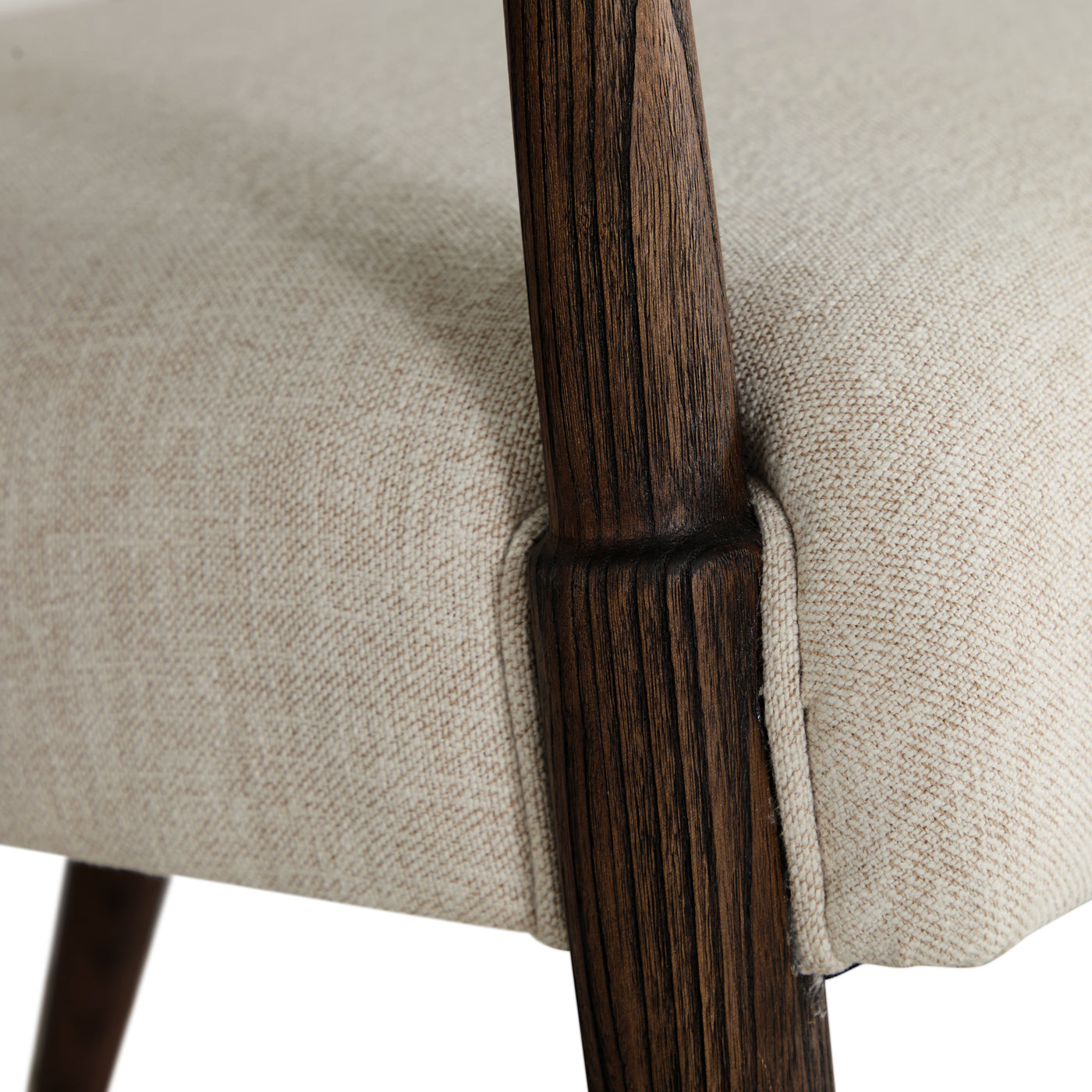 The Highland Dining Arm Chair in Dusk pairs refined design with rich character. Constructed from oak in a deep Dusk finish, it exudes warmth and dimension, perfectly offset by the light Slipaway Sand performance upholstery. The chair’s sculpted arms, supportive back, and brass-toned accent bar create a harmonious balance between comfort and style. Ideal for dining rooms that blend modern and traditional sensibilities, this arm chair embodies effortless sophistication.