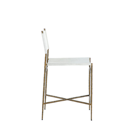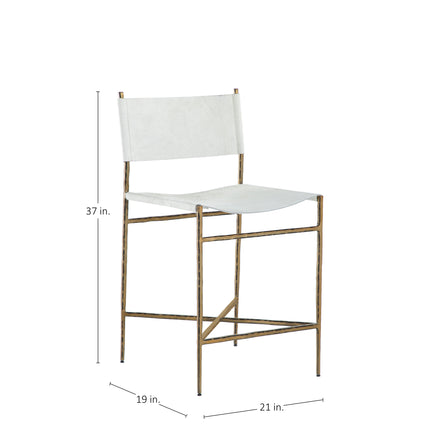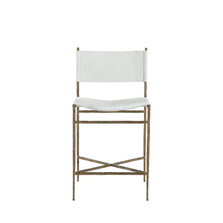The Landon Counter Stool is a luxe take on the classic director's chair, featuring chic tapered legs and crisscross stretchers. The stool is upholstered with ivory hair-on-hide seat and back panels, adding a touch of sophistication. The antique aged-brass finish on the metal frame complements the textural elements of the ivory hair-on-hide, creating a contemporary yet timeless piece perfect for modern interiors.