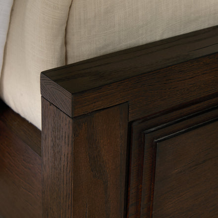 The Wren Bed in Dusk pairs timeless design with rich materiality. Crafted from oak in a deep, moody finish, the bed’s simple profile is accentuated by subtle carved detailing and refined joinery. Its sturdy frame and visible wood grain highlight the natural beauty of the oak, offering a grounded and sophisticated centerpiece for the bedroom. Available in both Queen and King sizes.