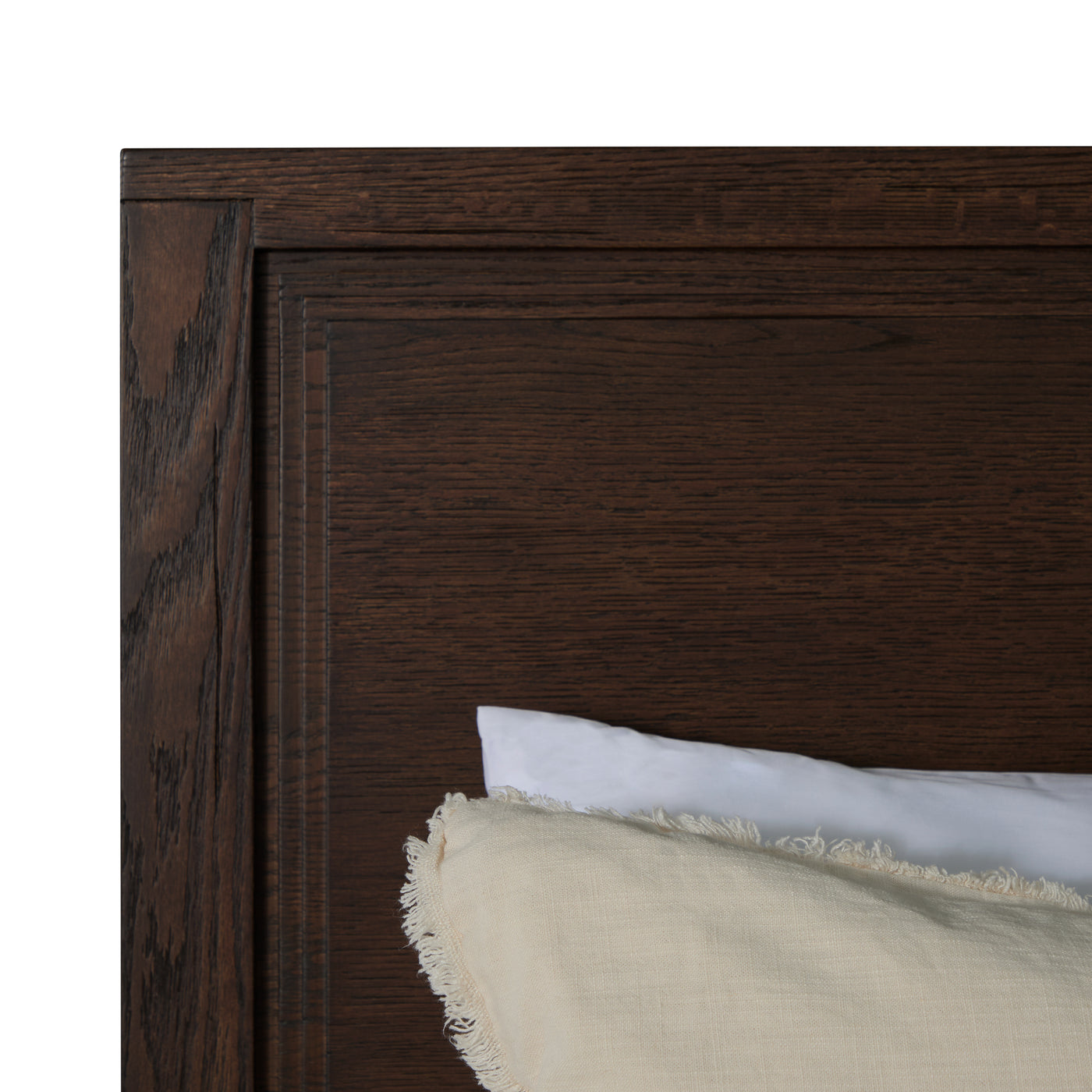 The Wren Bed in Dusk pairs timeless design with rich materiality. Crafted from oak in a deep, moody finish, the bed’s simple profile is accentuated by subtle carved detailing and refined joinery. Its sturdy frame and visible wood grain highlight the natural beauty of the oak, offering a grounded and sophisticated centerpiece for the bedroom. Available in both Queen and King sizes.