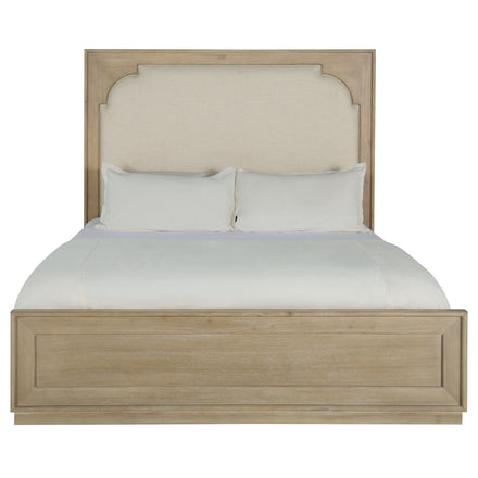 The Windsor King Bed exudes timeless sophistication with its clean lines and graceful architectural detailing. Crafted from mahogany in the Drift finish, it showcases a warm, natural tone that highlights the beauty of the wood grain. The upholstered headboard, covered in Slipaway Ivory performance fabric, offers a soft contrast and features a beautifully curved inset design that adds a touch of refinement. The 68-inch-tall headboard creates an elegant focal point, while the framed footboard introduces subtle dimension and balance. Designed with versatility in mind, the Windsor includes an adjustable slat height—allowing the option to use or forgo a box spring. Durable and elegant, the performance fabric ensures easy maintenance and everyday livability, making the Windsor as practical as it is refined.