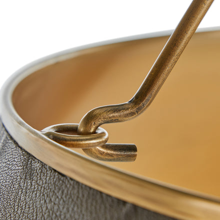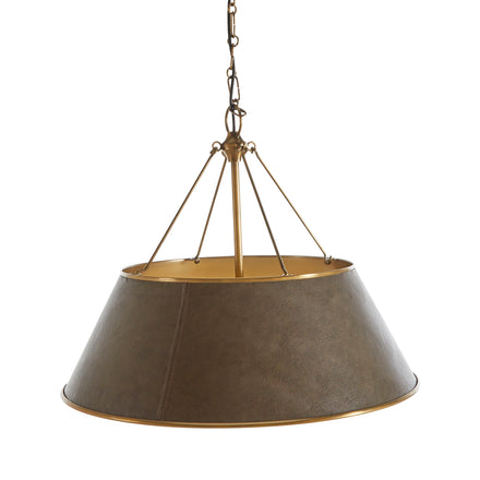 Inspired by the classical brass chandeliers of the 1950's and 60's, the Mariana Pendant Light seamlessly blends vintage charm with modern sophistication. Featuring a sleek Brushed Antique Bronze frame and a striking Dark Leather wrapped shade, this pendant exudes understated luxury. The interior of the shade diffuses light in a warm glow, refracting off the antique bronze finish.