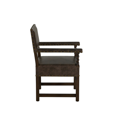 The Paloma Accent Chair is a modern homage to 17th-century English Jacobean design, blending old-world craftsmanship with enduring sophistication. Crafted from oak in a rich Dusk finish, the chair’s structured silhouette, turned barley twist legs and stretchers, and rectilinear back reflect the defining hallmarks of the Jacobean aesthetic. Wrapped in supple Venerando Coffee top-grain leather, the seat and backrest exude warmth and character, their deep tones enhanced by the subtle sheen of Mountain Bronze nailhead trim. Each detail—from the sculptural spiral carvings to the precise upholstery—honors the craftsmanship and ornamentation that made Jacobean furniture timeless, resulting in a piece that feels both stately and refined, perfectly suited for sophisticated interiors.