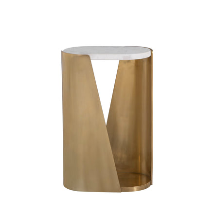 Sculptural and refined, the Horizon Drink Table brings artistry to small-scale design. The tabletop features an elegant oval slab of white Volakas marble, offering a cool, polished surface for a cocktail, book, or accent piece. Its brushed brass frame wraps gracefully around the base, with one side angling downward to partially conceal the lower shelf and the other rising clean and straight to support the marble top. This asymmetrical balance creates movement and visual intrigue, allowing the table’s silhouette to shift beautifully when viewed from different angles. Compact in size yet full of character, the Horizon Drink Table makes a sophisticated statement beside a chair, sofa, or lounge setting.