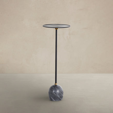 The Neil Drinking Table is the epitome of simplicity and sophistication. Its compact design offers the perfect solution for holding a beverage without occupying much floor space. The elegant rimmed tabletop is beautifully supported by a solid block of intricately detailed marble, creating a harmonious blend of functionality and opulence. Crafted from iron and marble, this table features finishes in black metal, antique gold, and gray marble, making it a striking yet understated addition to any living space.