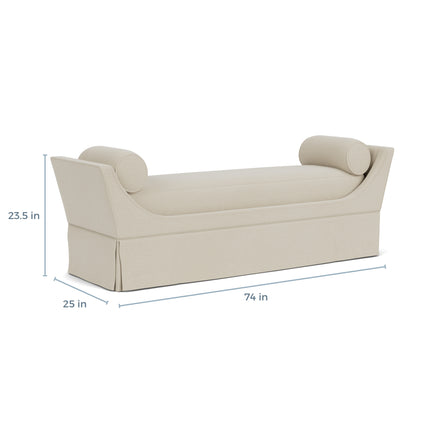 The Gayle Bench is a statement of Hollywood glamour and sophisticated design. This fully upholstered backless bench boasts a chic kick pleat skirt and an elegantly swooped frame, that can be accentuated by a double row of nailhead trim around its curveds silhouette. Perfect for adding a touch of luxury to any setting, the Gayle Bench is available in king, queen, and twin sizes to suit various needs and spaces. Note that the Large (King) and Medium (Queen) sizes are further complemented by two round pillows to finish the look.