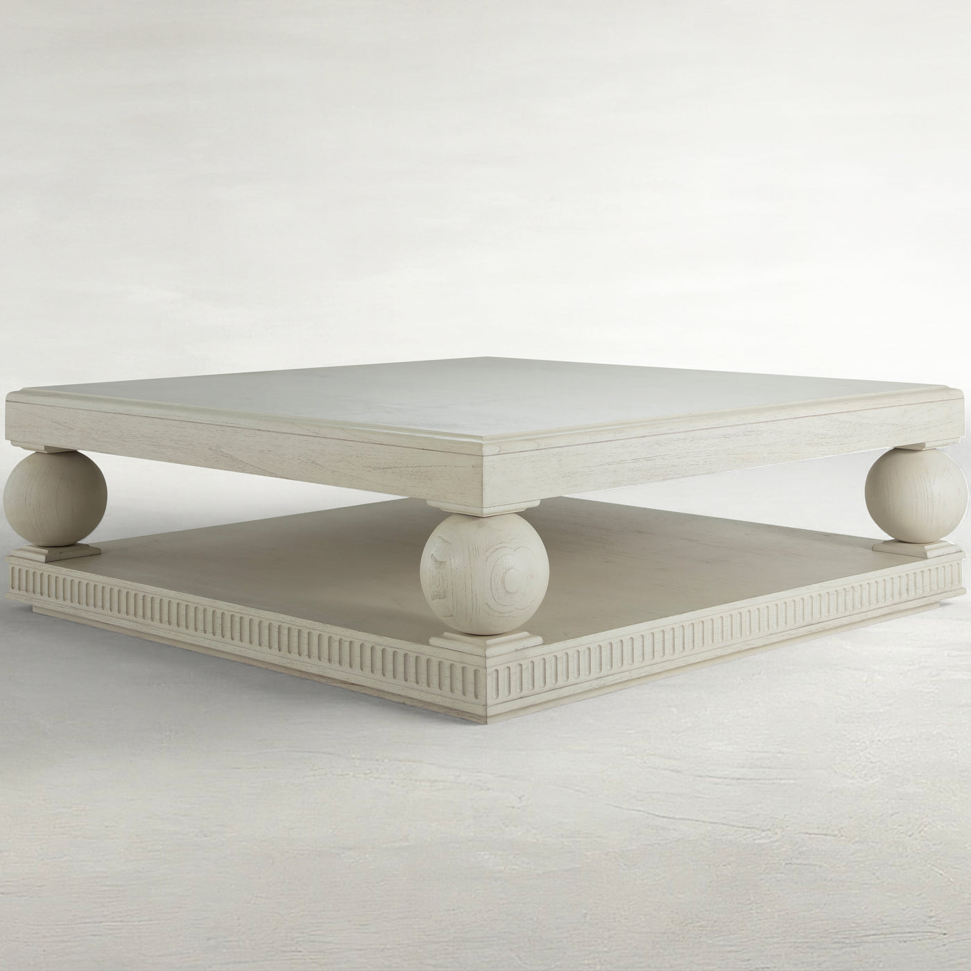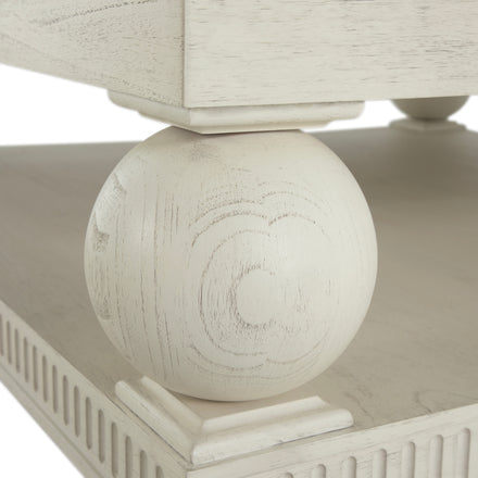 The Bronte Coffee Table embodies stately and classic design elements in a new approach. The square coffee table features clean lines and two levels of sufficient storage space. Made of Sungai wood, sustainably sourced from river regions in Southeast Asia, known for its durability, distinctive grain patterns, and eco-friendly origins, its finished with an oak veneer top, showcasing an Antique Brushed White finish. This product uses natural or handmade materials, so variations in color and pattern are to be expected and celebrated.