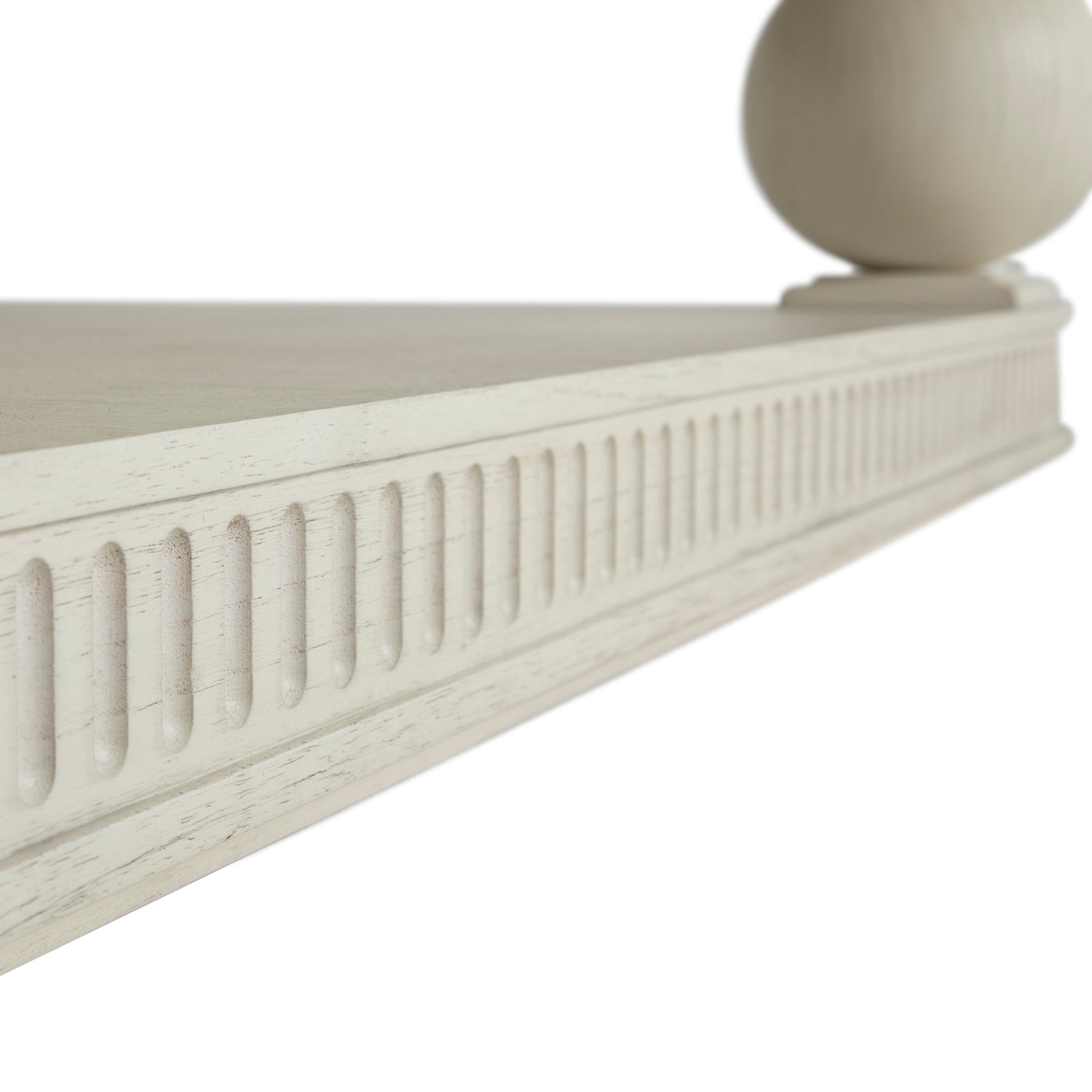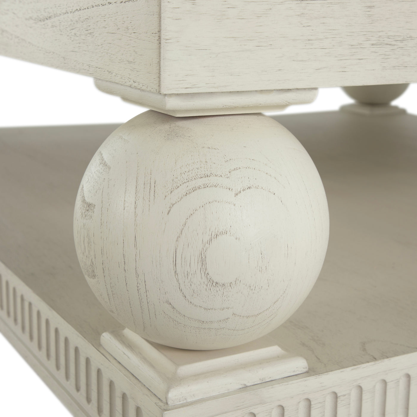 - Crafted from durable Sungai wood with an oak veneer top, showcasing natural grain and an antique brushed white finish