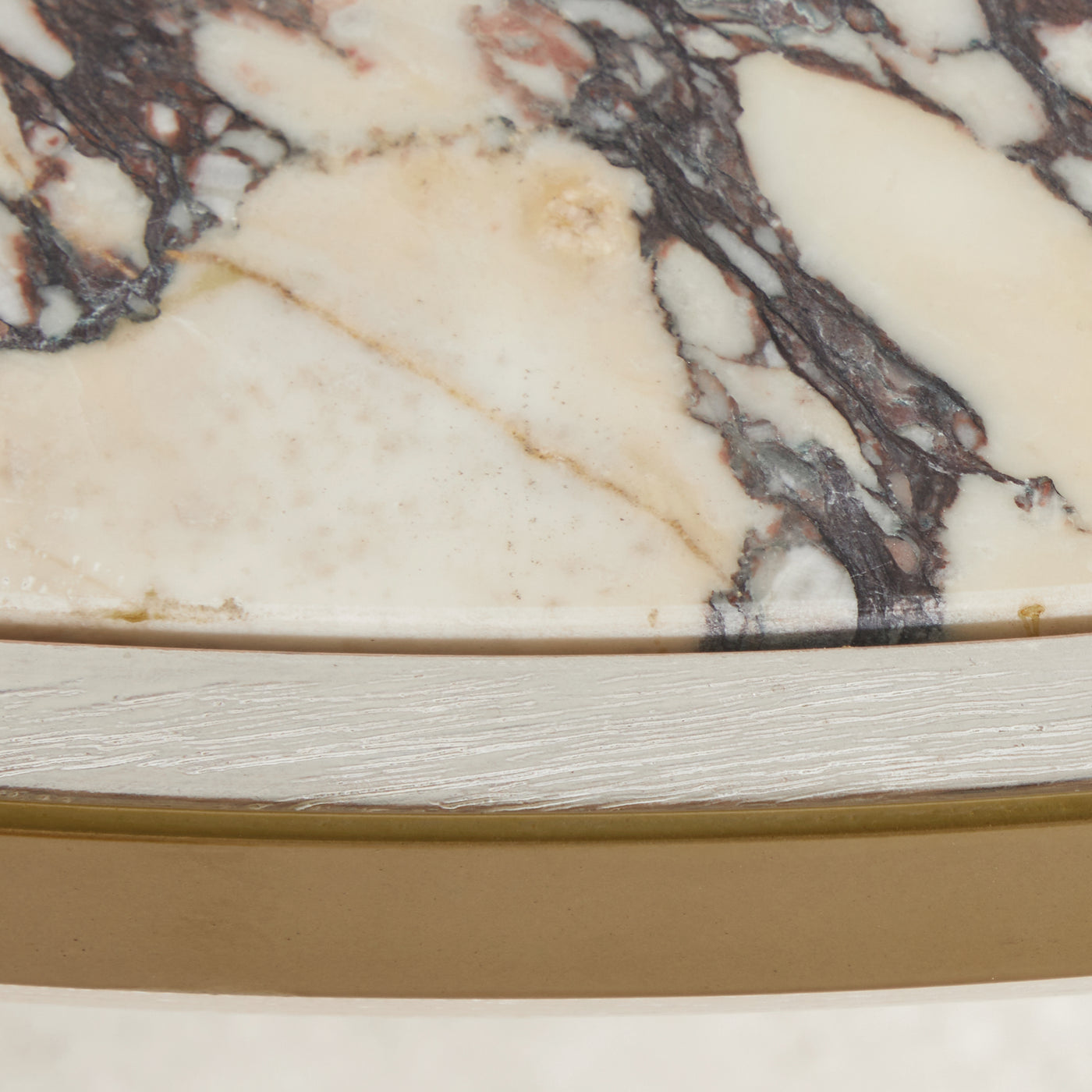 The Cain Coffee Table in White Cerused Oak is a masterpiece of modern Italian elegance. Topped with exquisite Calcutta Viola marble, its soft white surface is beautifully veined with deep, organic patterns, creating a striking yet refined aesthetic. The antique brass band encircling the edge adds a touch of timeless glamour, while the sculptural base in a genuine white cerused oak veneer brings warmth and sophistication. A true fusion of natural beauty and contemporary design, this table is a statement of effortless luxury for the stylish home.