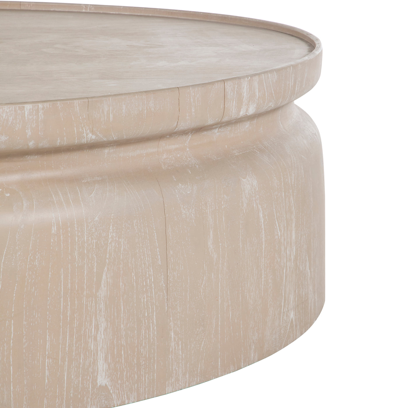 Our scene-stealing Marta Coffee Table slides in just about anywhere with a 15" height making it especially accomodating around low-rise sectionals, sofas and lounge chairs. Fashioned from. mindy wood, the profile is precisely lathed to create a recessed effect. Rounded edges with no sharp corners to bump into are a smart choice for families and pets. Its light cerusing looks radiant in any setting.