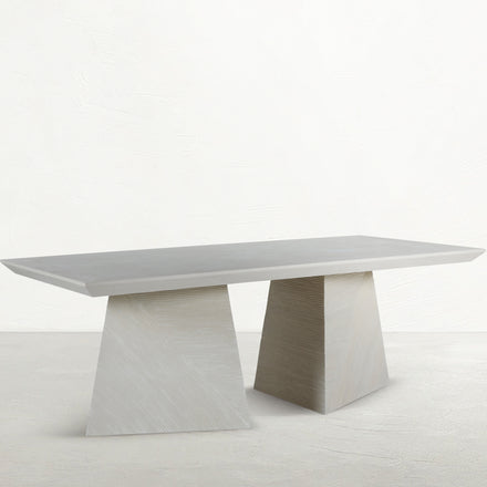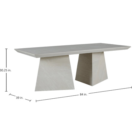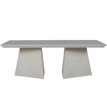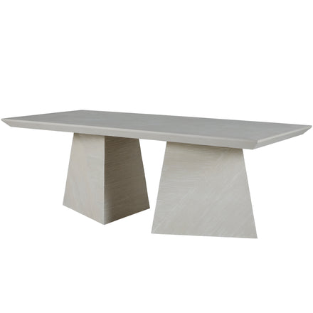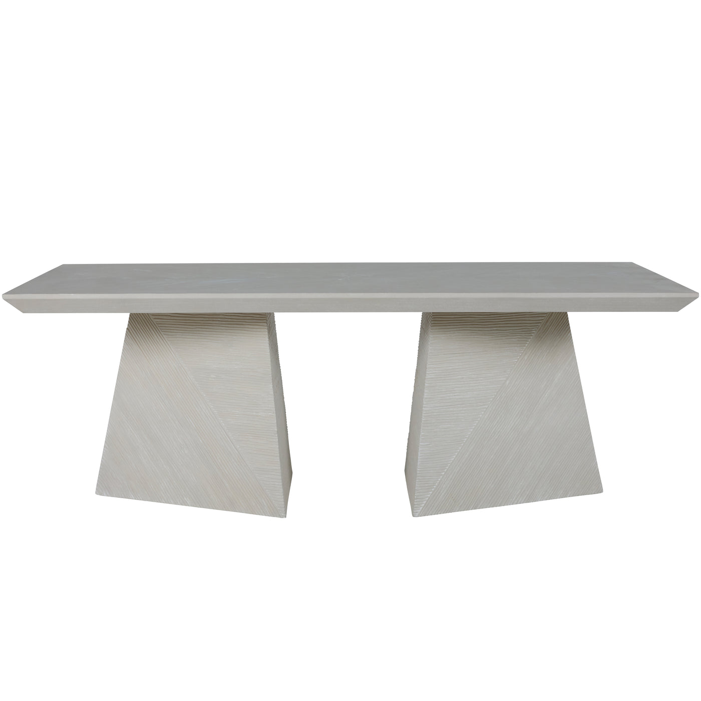 The Atticus Dining Table reimagines the traditional rectangular dining table with a contemporary twist, featuring two angular pedestals. The highly textured ribbed carving on the pedestals creates a three-dimensional, multi-sided appearance that beautifully complements the wood-patterned tabletop. Finished in cerused white, this table offers infinite styling opportunities for mixing and matching dining chairs. Crafted from mindi wood, the Atticus Dining Table seamlessly blends modern design with timeless elegance, making it a striking centerpiece for any dining space.