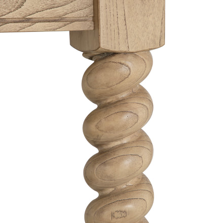 The Ferdinand Dining Table draws inspiration from French antique farm dining tables, elegantly merging vintage charm with modern functionality. Honoring classic design elements such as the light blonde hue, parqueted veneer tabletop, and traditional structure, it seamlessly fits contemporary standards. Crafted from Sungai wood and oak veneer, this table showcases intricate wood grain patterns and a meticulously crafted surface. Measuring 108 inches wide, it provides ample space for dining, making it ideal for large gatherings of 8-10 people. Its solid construction and stylish finish make it a standout piece in any dining area, offering both functionality and aesthetic appeal.