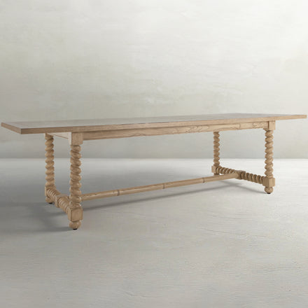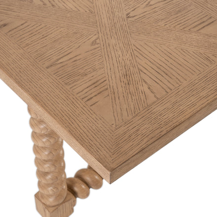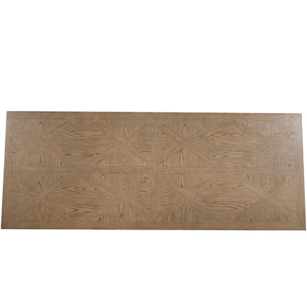 The Ferdinand Dining Table 84 inches draws inspiration from French antique farm dining tables, beautifully blending vintage charm with modern practicality. It honors classic design elements, including the light blonde hue, parqueted veneer tabletop, and traditional structure, while seamlessly fitting contemporary standards. Crafted from Sungai wood and oak veneer, this table showcases intricate wood grain patterns and a meticulously crafted surface. With its generous dining space, it's perfect for gatherings of up to 6 people and meals with family and friends. Its solid construction and stylish finish make it a standout piece in any dining area, offering both functionality and aesthetic appeal.