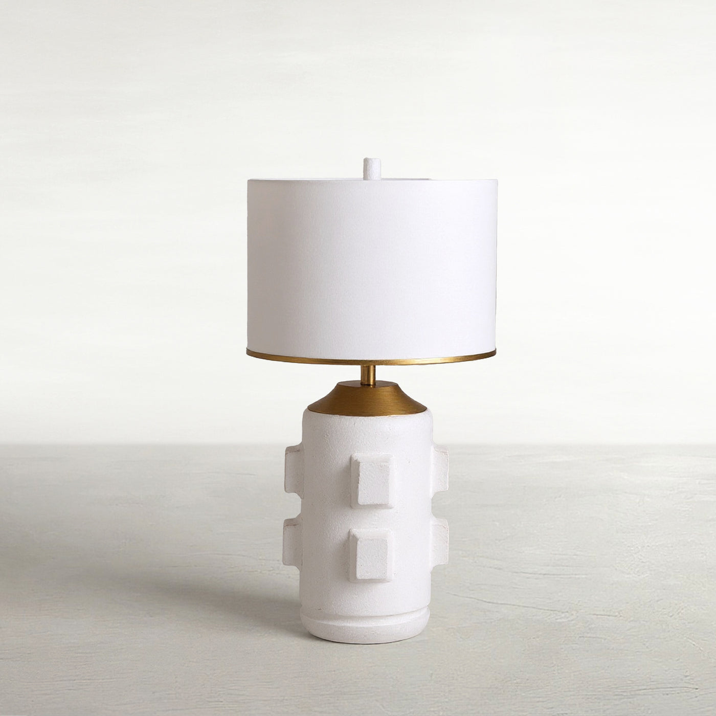 The Bridget Table Lamp captures the essence of mid-century modern design, reflecting a moment of daring experimentation with shapes. Its crisp white base, adorned with geometric detailing, is beautifully complemented by a vintage gold finish at the top. This striking composition is crowned with a feather white linen shade, perfectly proportioned to the lamp's bold silhouette. The Bridget Table Lamp adds a touch of retro sophistication to any space, blending seamlessly with both contemporary and classic decor.