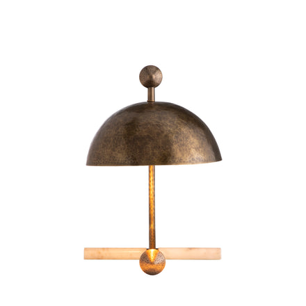 The Etna Task Lamp brings a touch of artisanal charm to your workspace. Its hammered metal dome shade and stand offer a unique texture, complemented by a sturdy speckled white marble base. The minimalist design is enhanced by spherical accents, providing both functionality and a sophisticated aesthetic. Perfect for adding a warm, focused light to any desk or side table, its warm glow is sure to encourage focus-minded work.