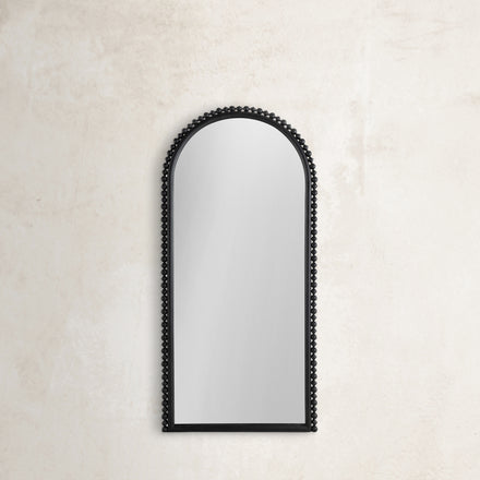 The Belle Mirror stands as a striking, tall statement piece, now available in a sleek plaster black finish, measuring an impressive 72" high by 32" wide. Its gracefully arched shape adds height and elegance to any space, while the plaster black finish brings a modern edge to its timeless design. The intricate pattern of alternating diamond and circle shapes around the frame offers artistic flair, enhancing the mirror's bold aesthetic without overpowering the room. Perfect for entryways, living rooms, or bedrooms, the Belle Mirror in plaster black blends form and function, providing a sophisticated focal point that elevates your decor with contemporary style. Also available in distressed white.