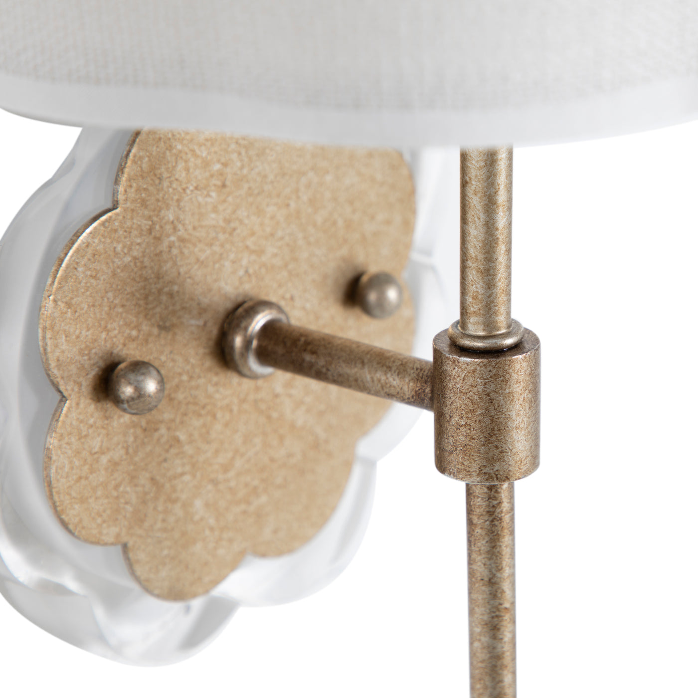 The Shirley Sconce elevates floral motifs to new heights with its miniature and elegant design. The scalloped acrylic backplate and matching demilune shade create a multitude of dainty curves, making this petite wall sconce an elevated piece in any room. Finished in either a champagne or antique gold hue, it adds a touch of refined elegance to hallways, bedrooms, or living spaces, blending seamlessly with both contemporary and traditional decor.